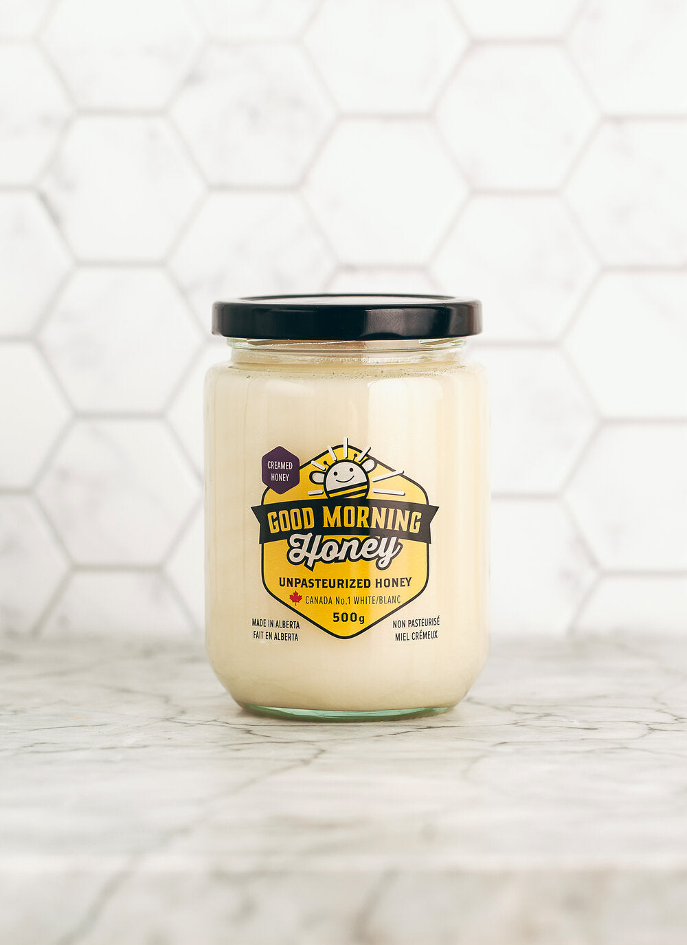 Beautiful creamed honey, produced by bees in the Parkland County. This creamed honey is pure and unpasteurized.