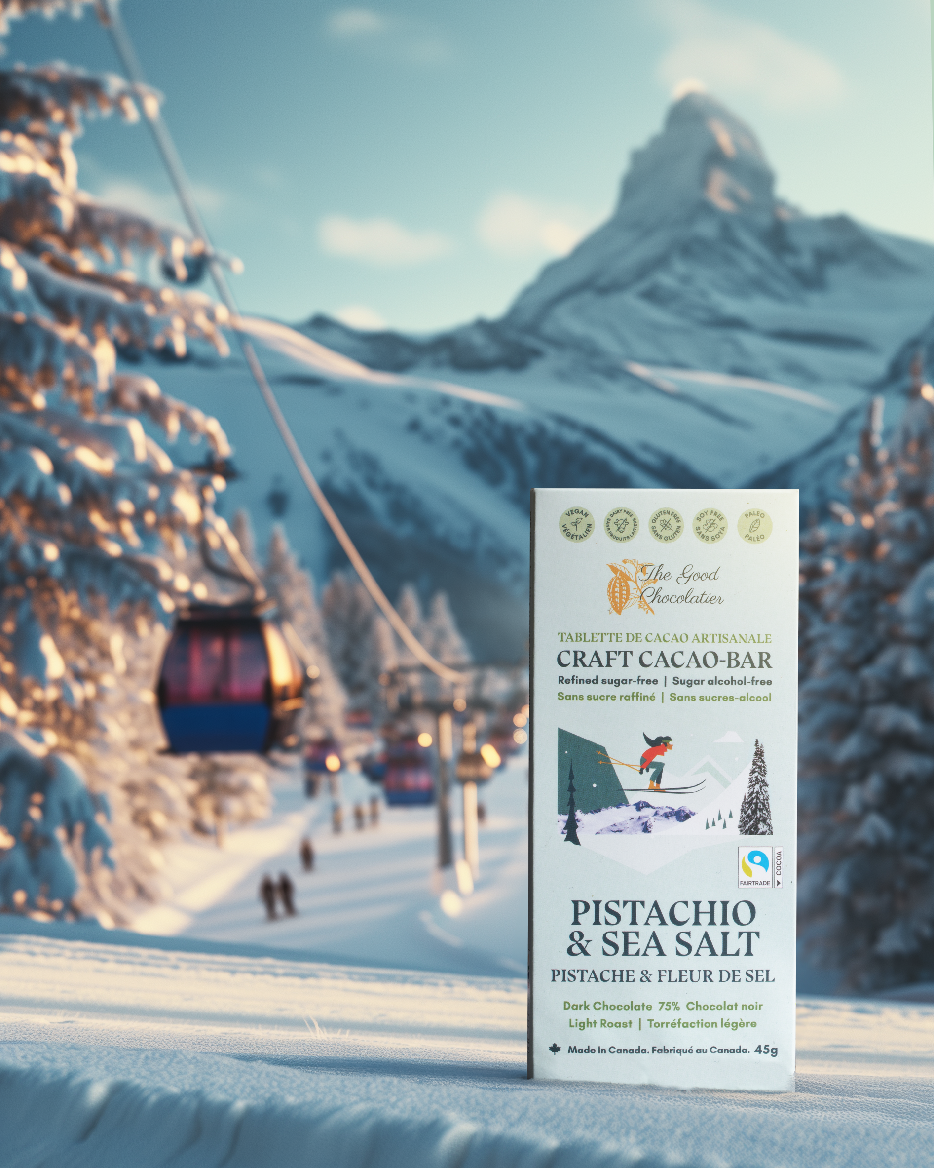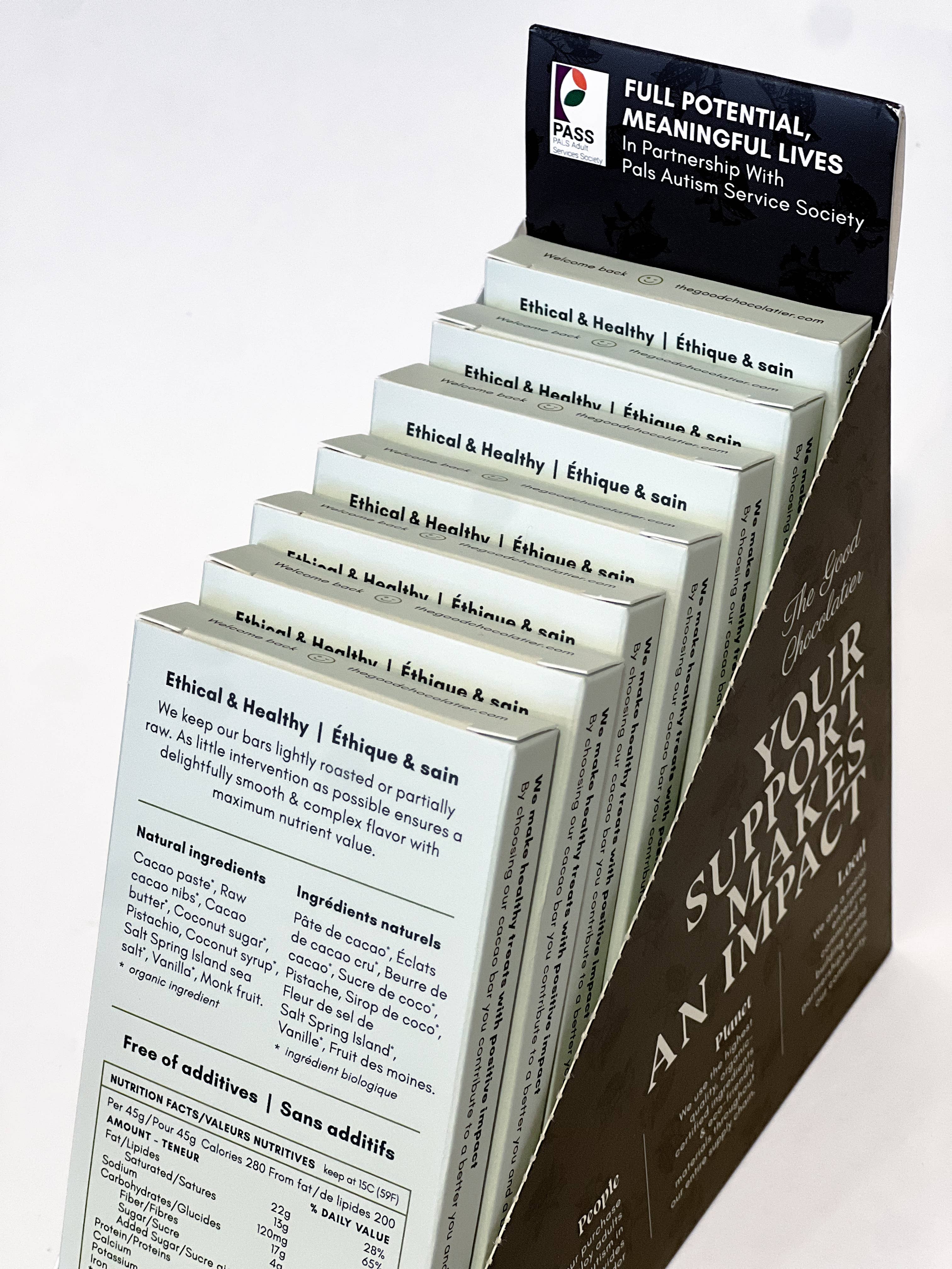 Ingredients: Cacao paste**, raw cacao nibs **, raw cacao butter**, coconut sugar**, pistachios*, Salt Spring Island sea salt**, vanilla*. *Organic **Organic & Fair Trade ***Organic & Local from BC