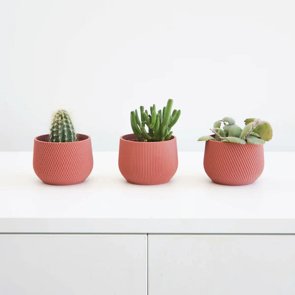 Mini Planter Set: This mini indoor planter set is perfect for small succulents and cacti. They are 3D printed using sustainable, plant-based materials and are 100% zero waste! The planters perfectly fit 2" potted plants. No Drainage Holes.