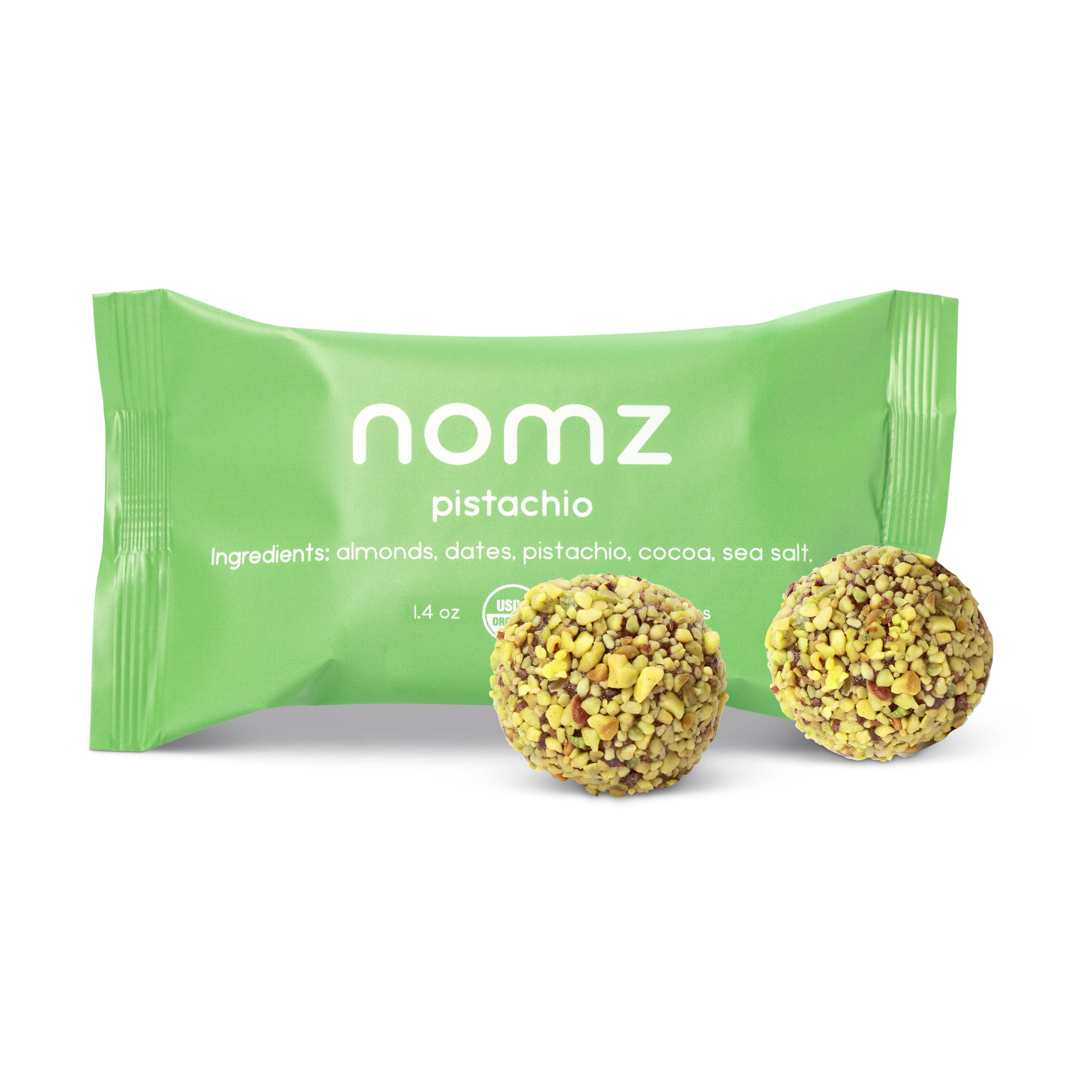 Organic Pistachio Energy Bites: Delicious chocolaty snacks with benefits. Ideal for hangry kiddos and toddlers, a pre-workout snack, your afternoon pick me up or snacking on the go. Each serving of Nomz organic bites is packed with hunger-crushing healthy fats, fiber, and protein.