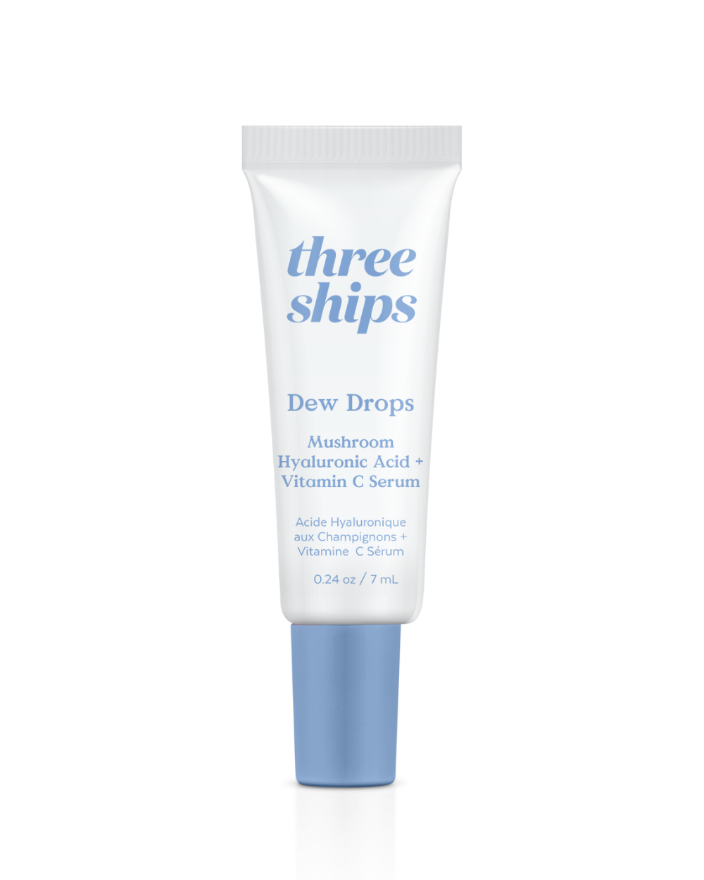 Dew Drops Serum Mini: Mushroom Hyaluronic Acid + Vitamin C Serum. This hyaluronic acid serum brightens and firms skin.
